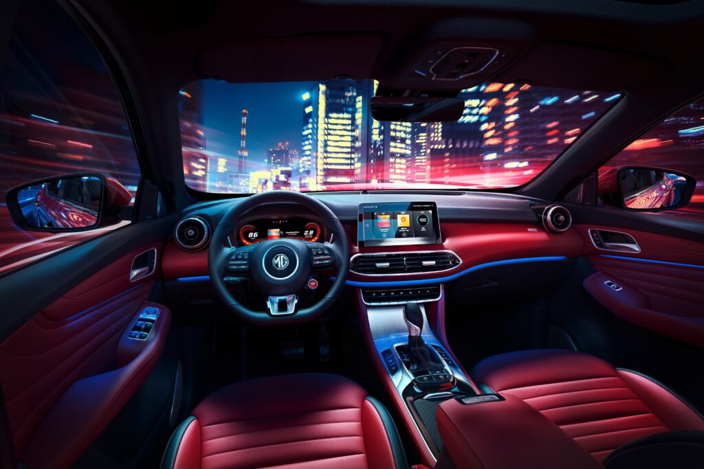 The MG HS MCE draws attention with it’s ferociously aggressive appearance, especially the front-end design, which resembles a hungry shark on the prowl. The MG signature Digital Flame grille is flanked by slender Bi – Function LED headlamp, Tailamps and DRL’s that exude strength and domination; complemented by eye-catching 18-inch new diamond-cut alloy wheels and vibrant red sports brake disc calipers, this vehicle is a visual masterpiece. The vehicle’s wide stance and dynamic wide face profile complement its forceful appearance, underlining its athletic and aggressive nature as an SUV.